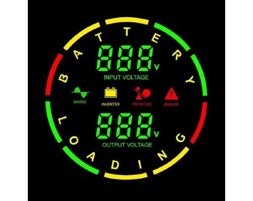 | Дисплей | Цветная индикация: входное и выходное напряжение,уровень заряда и нагрузки,режим работы,неисправность,ошибка |
